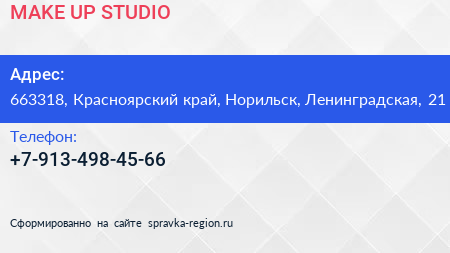 MAKE UP STUDIO по адресу 663318, Красноярский край, Норильск, Ленинградская, 21 в дальнейшем Организация, размещена в следующих категориях: