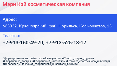 Мэри Кэй, косметическая компания по адресу 663332, Красноярский край, Норильск, Космонавтов, 13 в дальнейшем Организация, размещена в следующих категориях: