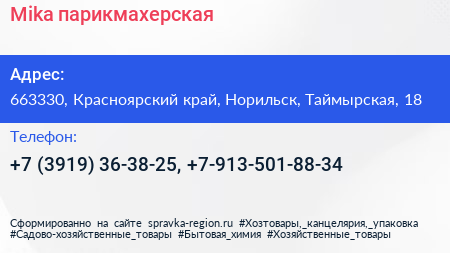 Mika, парикмахерская по адресу 663330, Красноярский край, Норильск, Таймырская, 18 в дальнейшем Организация, размещена в следующих категориях: