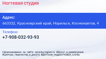 Ногтевая студия по адресу 663332, Красноярский край, Норильск, Космонавтов, 4 в дальнейшем Организация, размещена в следующих категориях:
