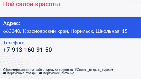 Ной, салон красоты по адресу 663340, Красноярский край, Норильск, Школьная, 15 в дальнейшем Организация, размещена в следующих категориях: