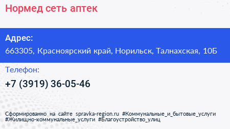 Нормед, сеть аптек по адресу 663305, Красноярский край, Норильск, Талнахская, 10Б в дальнейшем Организация, размещена в следующих категориях: