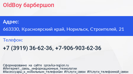 OldBoy, барбершоп по адресу 663330, Красноярский край, Норильск, Строителей, 21 в дальнейшем Организация, размещена в следующих категориях: