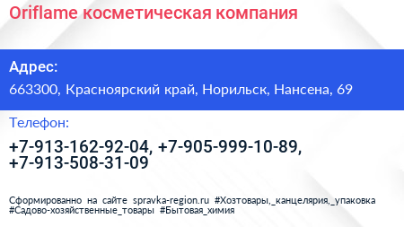 Oriflame, косметическая компания по адресу 663300, Красноярский край, Норильск, Нансена, 69 в дальнейшем Организация, размещена в следующих категориях: