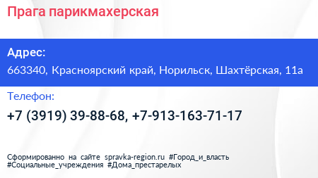 Прага, парикмахерская по адресу 663340, Красноярский край, Норильск, Шахтёрская, 11а в дальнейшем Организация, размещена в следующих категориях: