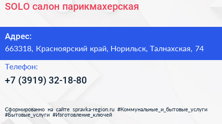 SOLO, салон-парикмахерская по адресу 663318, Красноярский край, Норильск, Талнахская, 74 в дальнейшем Организация, размещена в следующих категориях: