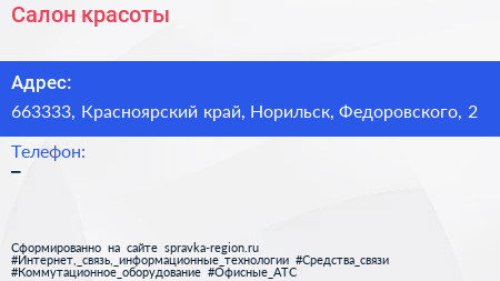 Салон красоты по адресу 663333, Красноярский край, Норильск, Федоровского, 2 в дальнейшем Организация, размещена в следующих категориях: