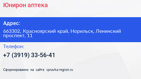Юнирон, аптека по адресу 663302, Красноярский край, Норильск, Ленинский проспект, 11 в дальнейшем Организация, размещена в следующих категориях:
