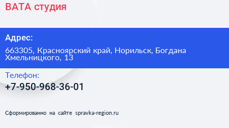 ВАТА, студия по адресу 663305, Красноярский край, Норильск, Богдана Хмельницкого, 13 в дальнейшем Организация, размещена в следующих категориях: