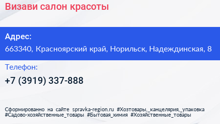 Визави, салон красоты по адресу 663340, Красноярский край, Норильск, Надеждинская, 8 в дальнейшем Организация, размещена в следующих категориях:
