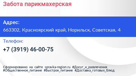 Забота, парикмахерская по адресу 663302, Красноярский край, Норильск, Советская, 4 в дальнейшем Организация, размещена в следующих категориях: