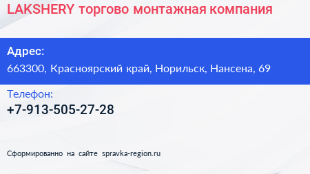 LAKSHERY, торгово-монтажная компания по адресу 663300, Красноярский край, Норильск, Нансена, 69 в дальнейшем Организация, размещена в следующих категориях: