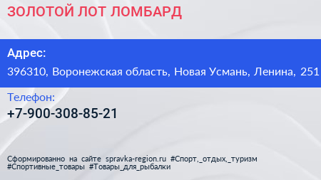 ЗОЛОТОЙ ЛОТ-ЛОМБАРД по адресу 396310, Воронежская область, Новая Усмань, Ленина, 251 в дальнейшем Организация, размещена в следующих категориях:
