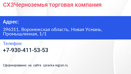 СХЗЧерноземья, торговая компания по адресу 396311, Воронежская область, Новая Усмань, Промышленная, 1/1 в дальнейшем Организация, размещена в следующих категориях: