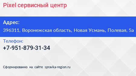 Pixel, сервисный центр по адресу 396311, Воронежская область, Новая Усмань, Полевая, 5а в дальнейшем Организация, размещена в следующих категориях: