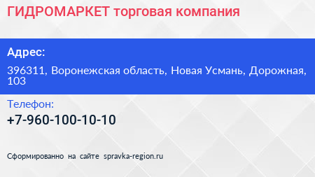 ГИДРОМАРКЕТ, торговая компания по адресу 396311, Воронежская область, Новая Усмань, Дорожная, 103 в дальнейшем Организация, размещена в следующих категориях:
