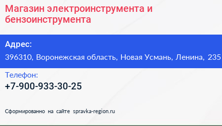 Магазин электроинструмента и бензоинструмента по адресу 396310, Воронежская область, Новая Усмань, Ленина, 235 в дальнейшем Организация, размещена в следующих категориях: