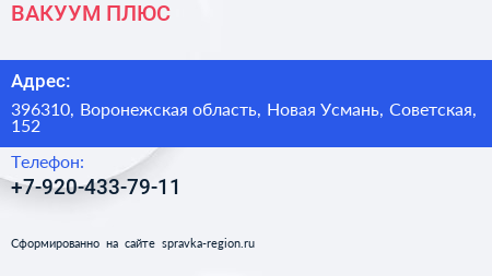 ВАКУУМ ПЛЮС по адресу 396310, Воронежская область, Новая Усмань, Советская, 152 в дальнейшем Организация, размещена в следующих категориях: