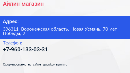 Айлин, магазин по адресу 396311, Воронежская область, Новая Усмань, 70 лет Победы, 2 в дальнейшем Организация, размещена в следующих категориях: