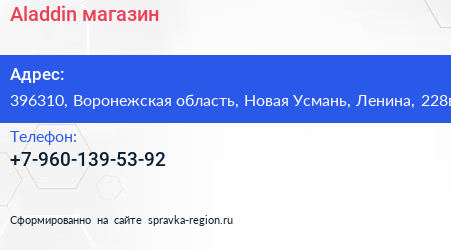 Aladdin, магазин по адресу 396310, Воронежская область, Новая Усмань, Ленина, 228в в дальнейшем Организация, размещена в следующих категориях: