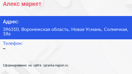 Алекс-маркет по адресу 396310, Воронежская область, Новая Усмань, Солнечная, 18а в дальнейшем Организация, размещена в следующих категориях: