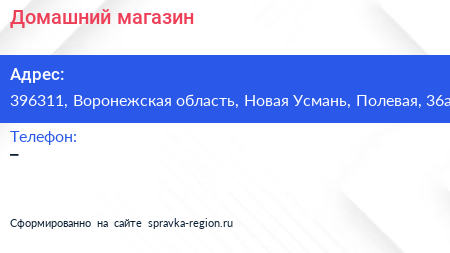 Домашний, магазин по адресу 396311, Воронежская область, Новая Усмань, Полевая, 36а в дальнейшем Организация, размещена в следующих категориях:
