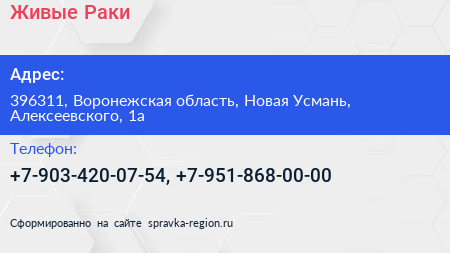 Живые Раки по адресу 396311, Воронежская область, Новая Усмань, Алексеевского, 1а в дальнейшем Организация, размещена в следующих категориях: