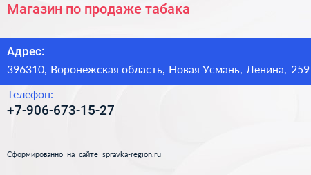 Магазин по продаже табака по адресу 396310, Воронежская область, Новая Усмань, Ленина, 259 в дальнейшем Организация, размещена в следующих категориях: