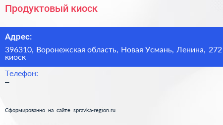 Продуктовый киоск по адресу 396310, Воронежская область, Новая Усмань, Ленина, 272 киоск в дальнейшем Организация, размещена в следующих категориях: