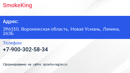 SmokeKing по адресу 396310, Воронежская область, Новая Усмань, Ленина, 263Б в дальнейшем Организация, размещена в следующих категориях: