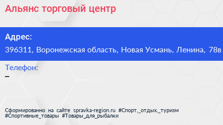 Альянс, торговый центр по адресу 396311, Воронежская область, Новая Усмань, Ленина, 78в в дальнейшем Организация, размещена в следующих категориях: