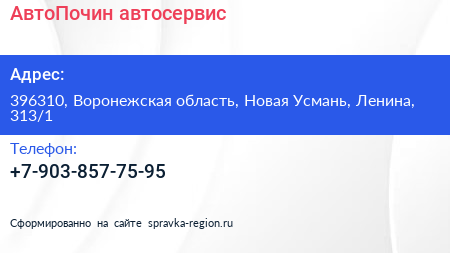 АвтоПочин, автосервис по адресу 396310, Воронежская область, Новая Усмань, Ленина, 313/1 в дальнейшем Организация, размещена в следующих категориях: