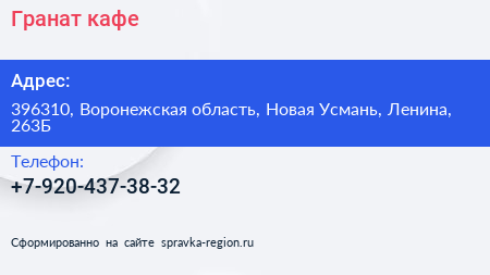Гранат, кафе по адресу 396310, Воронежская область, Новая Усмань, Ленина, 263Б в дальнейшем Организация, размещена в следующих категориях: