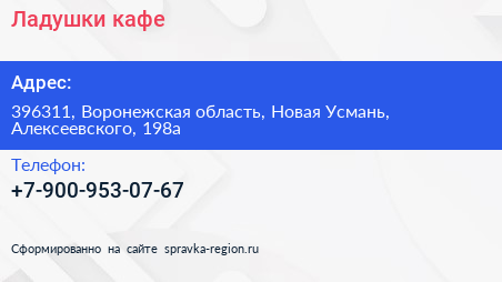 Ладушки, кафе по адресу 396311, Воронежская область, Новая Усмань, Алексеевского, 198а в дальнейшем Организация, размещена в следующих категориях: