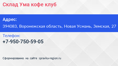 Склад Ума, кофе-клуб по адресу 394083, Воронежская область, Новая Усмань, Земская, 27 в дальнейшем Организация, размещена в следующих категориях: