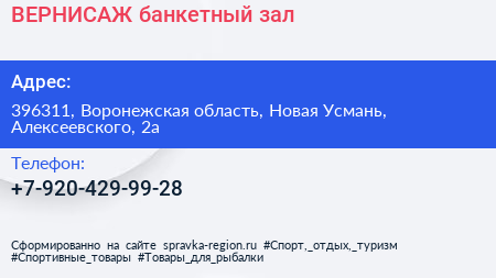 ВЕРНИСАЖ, банкетный зал по адресу 396311, Воронежская область, Новая Усмань, Алексеевского, 2а в дальнейшем Организация, размещена в следующих категориях: