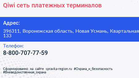 Qiwi, сеть платежных терминалов по адресу 396311, Воронежская область, Новая Усмань, Квартальная, 133 в дальнейшем Организация, размещена в следующих категориях: