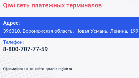 Qiwi, сеть платежных терминалов по адресу 396310, Воронежская область, Новая Усмань, Ленина, 199 в дальнейшем Организация, размещена в следующих категориях: