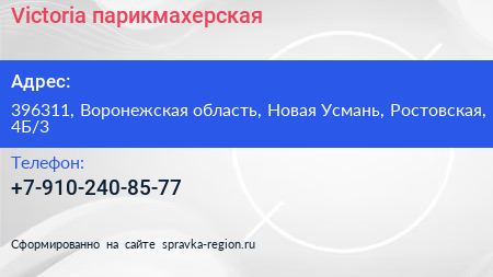 Victoria, парикмахерская по адресу 396311, Воронежская область, Новая Усмань, Ростовская, 4Б/3 в дальнейшем Организация, размещена в следующих категориях: