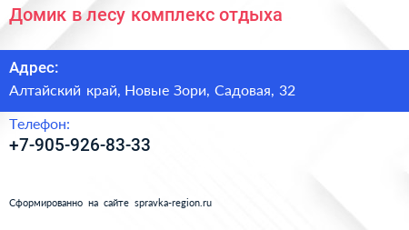 Домик в лесу, комплекс отдыха по адресу Алтайский край, Новые Зори, Садовая, 32 в дальнейшем Организация, размещена в следующих категориях: