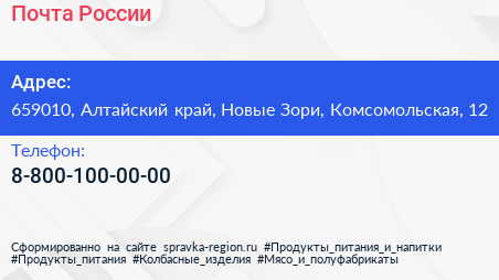 Почта России по адресу 659010, Алтайский край, Новые Зори, Комсомольская, 12 в дальнейшем Организация, размещена в следующих категориях: