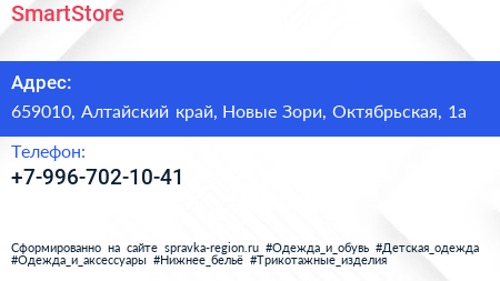 SmartStore по адресу 659010, Алтайский край, Новые Зори, Октябрьская, 1а в дальнейшем Организация, размещена в следующих категориях: