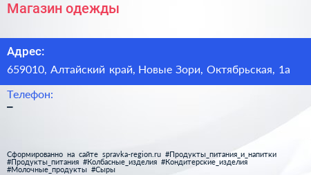 Магазин одежды по адресу 659010, Алтайский край, Новые Зори, Октябрьская, 1а в дальнейшем Организация, размещена в следующих категориях: