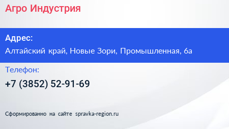 Агро Индустрия по адресу Алтайский край, Новые Зори, Промышленная, 6а в дальнейшем Организация, размещена в следующих категориях: