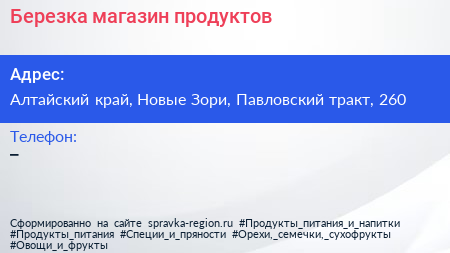 Березка, магазин продуктов по адресу Алтайский край, Новые Зори, Павловский тракт, 260 в дальнейшем Организация, размещена в следующих категориях:
