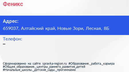 Феникс по адресу 659037, Алтайский край, Новые Зори, Лесная, 8Б в дальнейшем Организация, размещена в следующих категориях:
