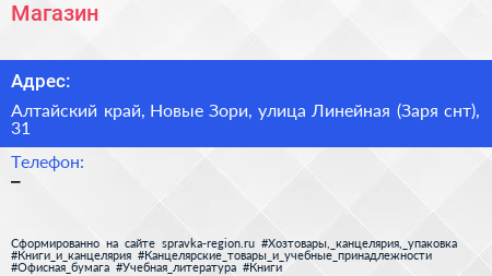 Магазин по адресу Алтайский край, Новые Зори, улица Линейная (Заря снт), 31 в дальнейшем Организация, размещена в следующих категориях: