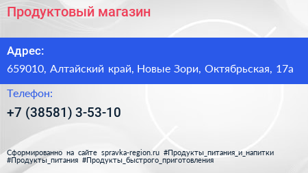 Продуктовый магазин по адресу 659010, Алтайский край, Новые Зори, Октябрьская, 17а в дальнейшем Организация, размещена в следующих категориях: