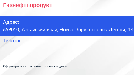 Газнефтьпродукт по адресу 659010, Алтайский край, Новые Зори, посёлок Лесной, 14 в дальнейшем Организация, размещена в следующих категориях: