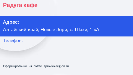 Радуга, кафе по адресу Алтайский край, Новые Зори, с. Шахи, 1 кА в дальнейшем Организация, размещена в следующих категориях: